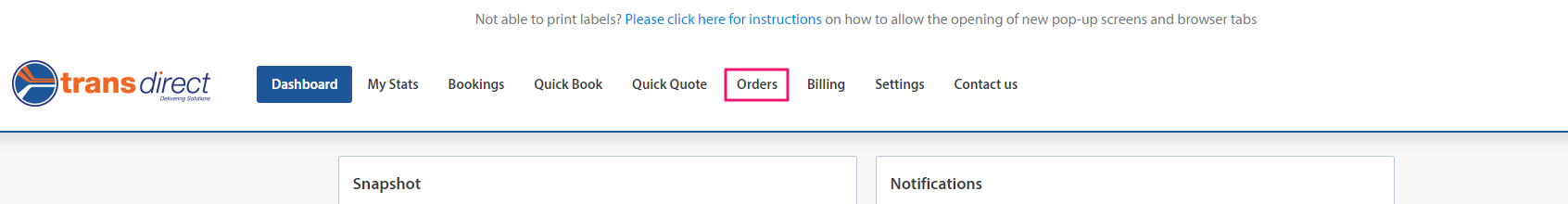 1. Login to your Transdirect Account and select Orders